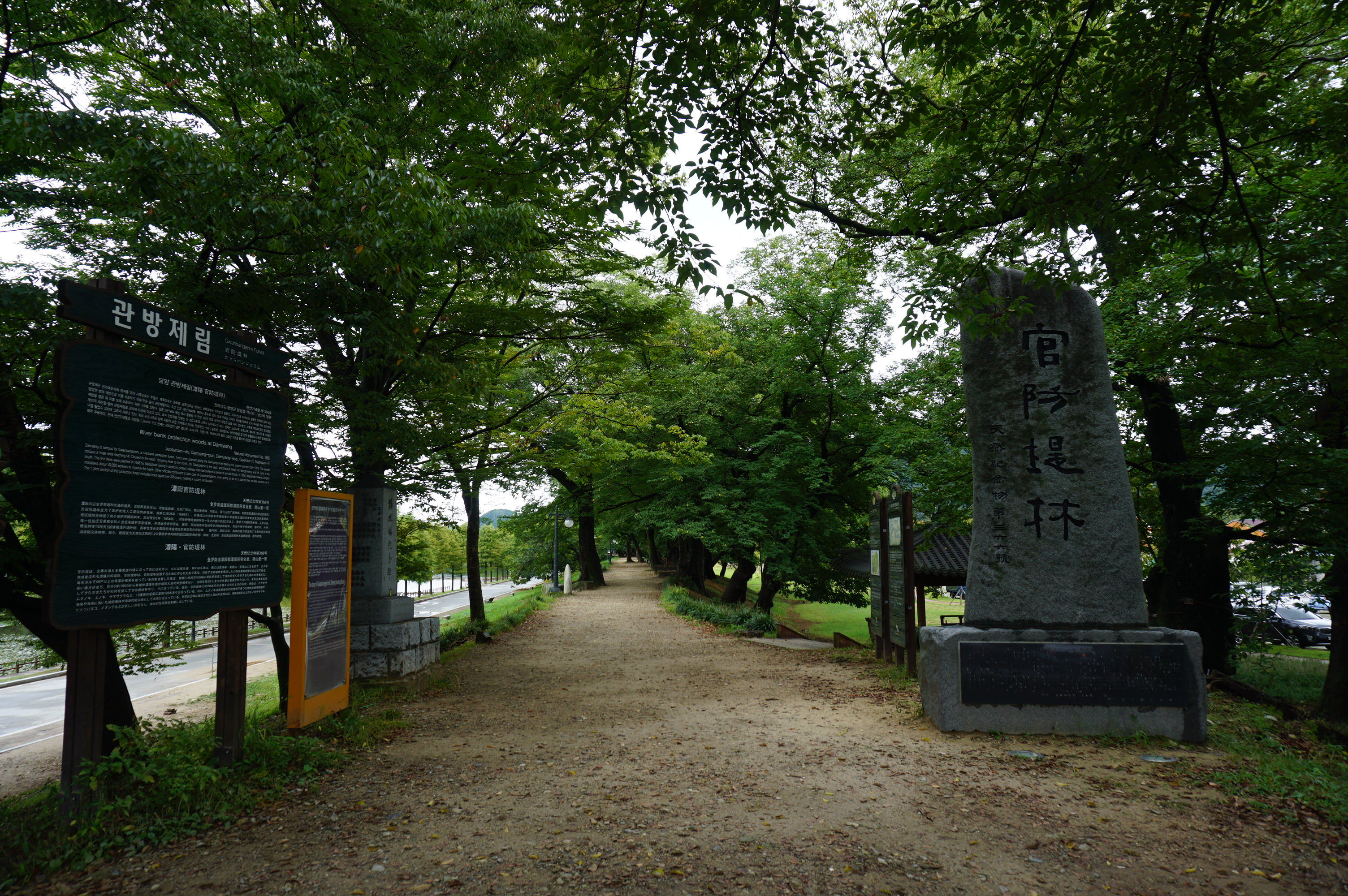 관방제는 관방천에 있는 제방으로서 담양읍 남산리 동정자 마을로부터 수북면 황금리를 지나 대전면 강의리까지 길이 6km에 이르는 곳이다. 관방제가 유명한 이유는 약 2km에 걸쳐 거대한 풍치림을 이루고 있기 때문이다. 이 풍치림을 관방제림이라고 부르는데 면적 4만 9228㎡에 추정수령 300~400년에 달하는 나무들이 빼곡하고 자리를 잡고 있다. 그 모습이 아름다워 1991년 11월 27일 천연기념물 제366호로 지정되었으며, 2004년에는 산림청이 주최한 '제5회 아름다운 숲 전국대회'에서 대상을 수상하기도 했다. 주요 수종은 푸조나무(111그루), 팽나무(18그루), 벚나무(9그루), 음나무(1그루), 개서어나무(1그루), 곰의말채,갈참나무 등으로 약 420그루가 자라고 있다. 현재 천연 기념물로 지정된 구역 안에는 185그루의 오래되고 큰 나무가 자라고 있다. 또한, 관방제림은 여름철 피서지로서 각광받고 있으며 젊은 연인들의 데이트 코스로도 널리 알려진 곳이다. 관방제림 주변의 고수부지에 추성 경기장이 위치해 있으며, 2005년 설화가 있는 조각공원이 들어서 볼거리를 더하고 있다.